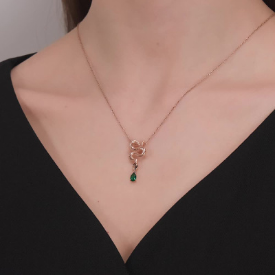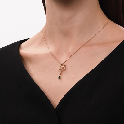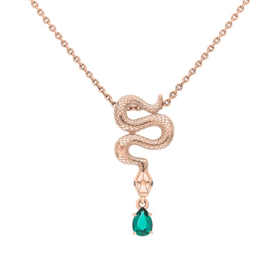 Подвеска с 1 гидротермальным изумрудом, 0.37 карат; 2 бриллиантами черными природными облагороженными, 0.008 карат, огранка круг 57 граней, цвет 7, чистота 6, тип огранки А; Розовое золото 585 пробы.