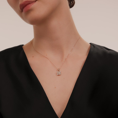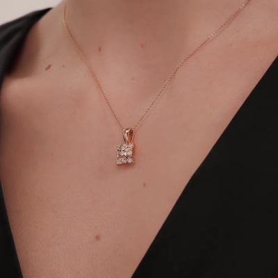 Подвеска с 4 бриллиантами природными, 0.3 карат, огранка круг 57 граней, цвет 3, чистота 6, тип огранки А; 4 бриллиантами природными, 0.22 карат, огранка круг 57 граней, цвет 3, чистота 6, тип огранки А; 1 бриллиантом природным, 0.04 карат, огранка круг 57 граней, цвет 3, чистота 6, тип огранки А; Розовое золото 585 пробы.