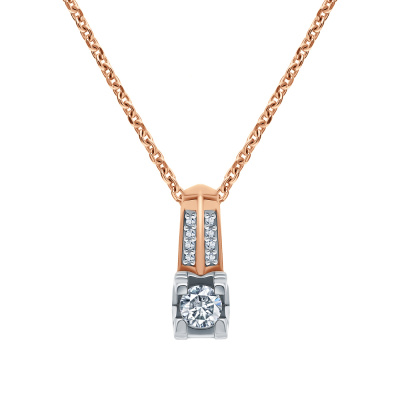 Подвеска с 1 бриллиантом природным, 0.1 карат, огранка круг 57 граней, цвет 3, чистота 6, тип огранки А; 8 бриллиантами природными, 0.01 карат, огранка круг 17 граней, цвет 2, чистота 2, тип огранки А; Розовое золото 585 пробы.