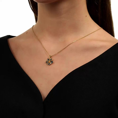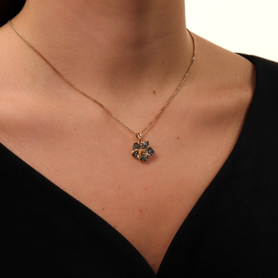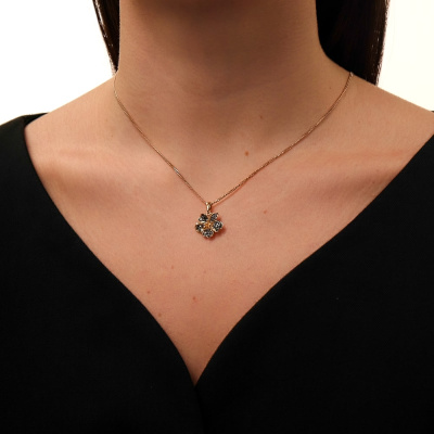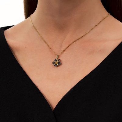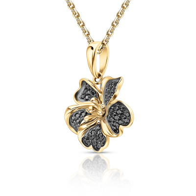 Подвеска с 39 бриллиантами черными природными облагороженными, 0.17 карат, огранка круг 57 граней, цвет 7, чистота 6, тип огранки А; 15 бриллиантами черными природными облагороженными, 0.03 карат, огранка круг 57 граней, цвет 7, чистота 6, тип огранки А; Желтое золото 585 пробы.