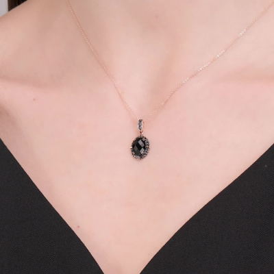 Подвеска с 5 бриллиантами черными природными облагороженными, 0.02 карат, огранка круг 57 граней, цвет 7, чистота 6, тип огранки А; 20 бриллиантами черными природными облагороженными, 0.06 карат, огранка круг 57 граней, цвет 7, чистота 6, тип огранки А; 1 ониксом черным природным; Розовое золото 585 пробы.