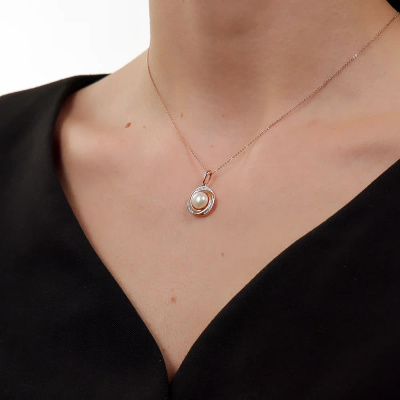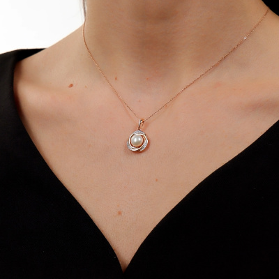 Подвеска с 15 бриллиантами природными, 0.03 карат, огранка круг 17 граней, цвет 2, чистота 2, тип огранки А; 1 жемчугом пресноводным культивированным белым; Розовое золото 585 пробы.