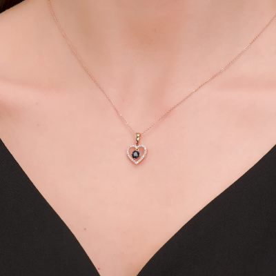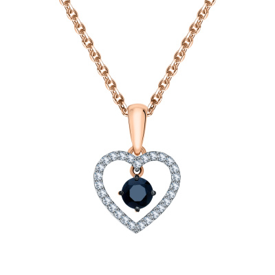 Подвеска с 27 бриллиантами природными, 0.11 карат, огранка круг 17 граней, цвет 2, чистота 2, тип огранки А; 1 сапфиром природным, 0.25 карат, цвет 2, чистота 2, тип огранки В; Розовое золото 585 пробы.