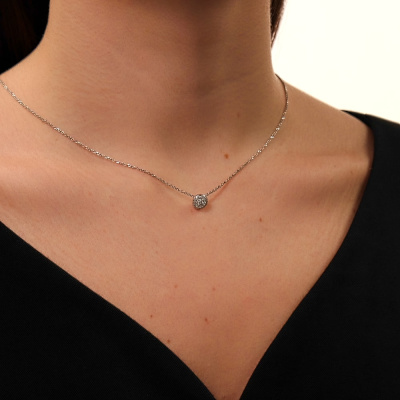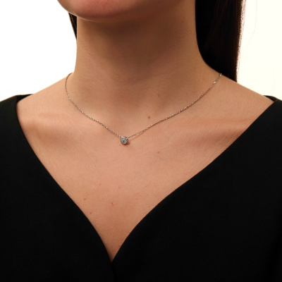 Подвеска с 1 бриллиантом природным, 0.04 карат, огранка круг 57 граней, цвет 3, чистота 6, тип огранки А; 7 бриллиантами природными, 0.05 карат, огранка круг 57 граней, цвет 3, чистота 6, тип огранки А; 16 бриллиантами природными, 0.08 карат, огранка круг 57 граней, цвет 3, чистота 6, тип огранки А; Белое золото 585 пробы.
