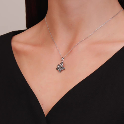 Подвеска с 22 бриллиантами черными природными облагороженными, 0.18 карат, огранка круг 57 граней, цвет 7, чистота 6, тип огранки А; 31 бриллиантом черным природным облагороженным, 0.18 карат, огранка круг 57 граней, цвет 7, чистота 6, тип огранки А; Белое золото 585 пробы.