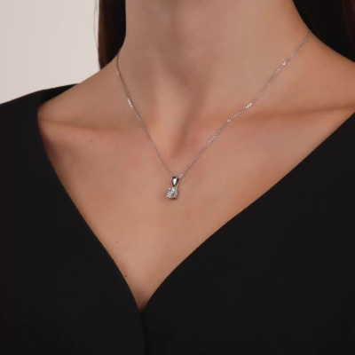 Подвеска с 1 бриллиантом природным, 0.06 карат, огранка круг 57 граней, цвет 4, чистота 5, тип огранки А; 12 бриллиантами природными, 0.04 карат, огранка круг 17 граней, цвет 2, чистота 2, тип огранки А; Белое золото 585 пробы.