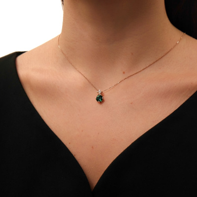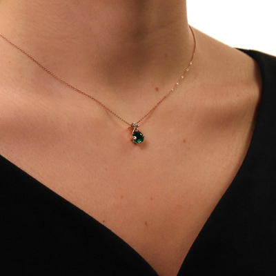 Подвеска с 3 бриллиантами природными, 0.01 карат, огранка круг 17 граней, цвет 2, чистота 2, тип огранки А; 1 гидротермальным изумрудом, 1.12 карат; Розовое золото 585 пробы.