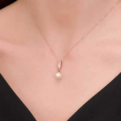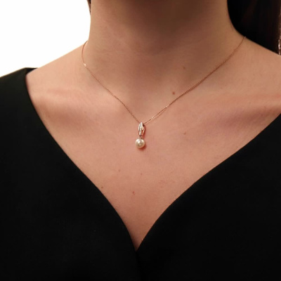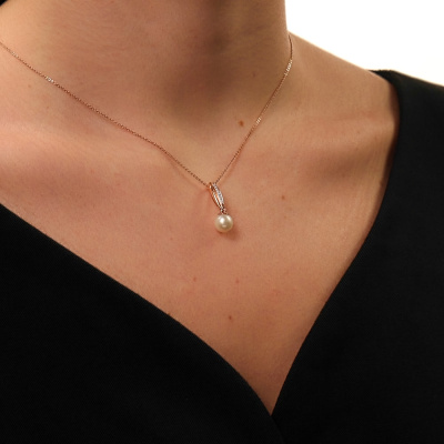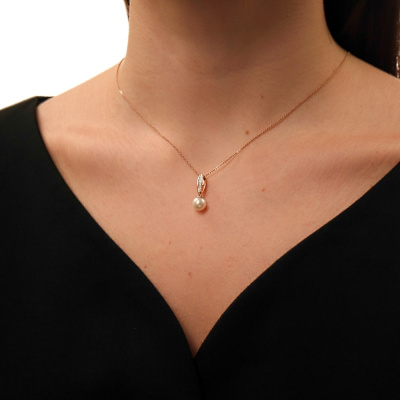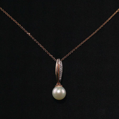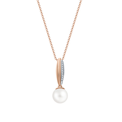 Подвеска с 9 бриллиантами природными, 0.02 карат, огранка круг 17 граней, цвет 2, чистота 2, тип огранки А; 1 жемчугом пресноводным культивированным белым; Розовое золото 585 пробы.