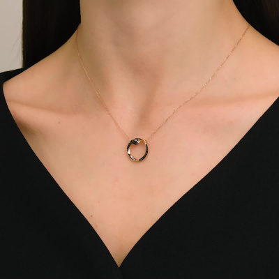 Подвеска с 3 бриллиантами черными природными облагороженными, 0.01 карат, огранка круг 57 граней, цвет 7, чистота 6, тип огранки А; 20 бриллиантами черными природными облагороженными, 0.07 карат, огранка круг 57 граней, цвет 7, чистота 6, тип огранки А; Розовое золото 585 пробы.