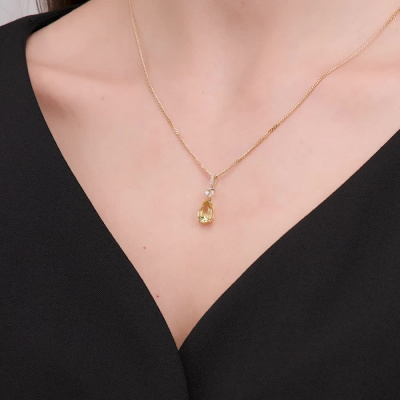 Подвеска с 5 бриллиантами природными, 0.02 карат, огранка круг 17 граней, цвет 2, чистота 2, тип огранки А; 1 кварцем лимонным природным, 1.68 карат; 1 горным хрусталем природным, 0.22 карат; Желтое золото 585 пробы.