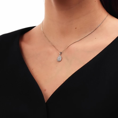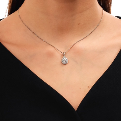 Подвеска с 1 бриллиантом природным, 0.19 карат, огранка круг 57 граней, цвет 3, чистота 6, тип огранки А; 2 бриллиантами природными, 0.11 карат, огранка круг 57 граней, цвет 3, чистота 6, тип огранки А; 6 бриллиантами природными, 0.13 карат, огранка круг 57 граней, цвет 3, чистота 6, тип огранки А; 20 бриллиантами природными, 0.16 карат, огранка круг 57 граней, цвет 3, чистота 6, тип огранки А; Белое золото 585 пробы.