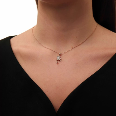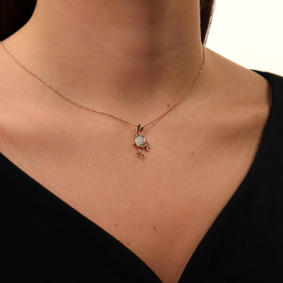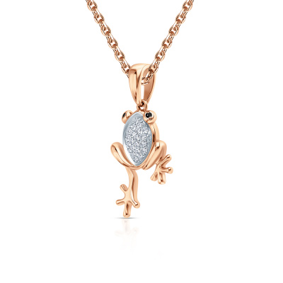 Подвеска с 27 бриллиантами природными, 0.1 карат, огранка круг 17 граней, цвет 2, чистота 2, тип огранки А; 2 бриллиантами черными природными облагороженными, 0.009 карат, огранка круг 57 граней, цвет 7, чистота 6, тип огранки А; Розовое золото 585 пробы.