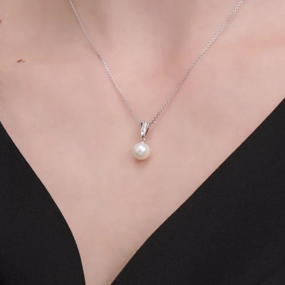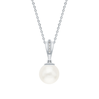 Подвеска с 4 бриллиантами природными, 0.01 карат, огранка круг 17 граней, цвет 2, чистота 2, тип огранки А; 1 жемчугом пресноводным культивированным белым; Белое золото 585 пробы.