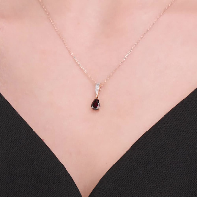 Подвеска с 4 бриллиантами природными, 0.01 карат, огранка круг 17 граней, цвет 2, чистота 2, тип огранки А; 3 бриллиантами природными, 0.006 карат, огранка круг 17 граней, цвет 2, чистота 2, тип огранки А; 1 гранатом природным, 0.84 карат; Розовое золото 585 пробы.