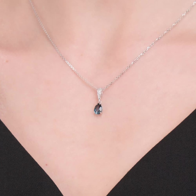 Подвеска с 4 бриллиантами природными, 0.01 карат, огранка круг 17 граней, цвет 2, чистота 2, тип огранки А; 3 бриллиантами природными, 0.005 карат, огранка круг 17 граней, цвет 2, чистота 2, тип огранки А; 1 топазом лондон природным, 0.72 карат; Белое золото 585 пробы.