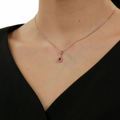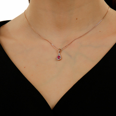 Подвеска с 23 бриллиантами природными, 0.04 карат, огранка круг 17 граней, цвет 2, чистота 2, тип огранки А; 1 рубином природным, 0.38 карат, цвет 2, чистота 2, тип огранки Б; Розовое золото 585 пробы.