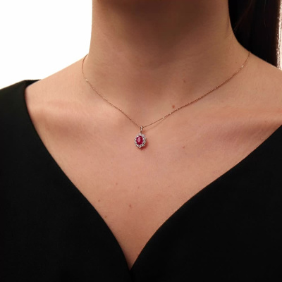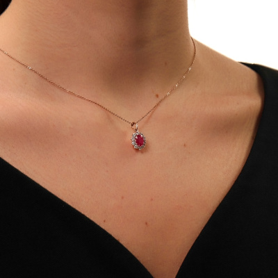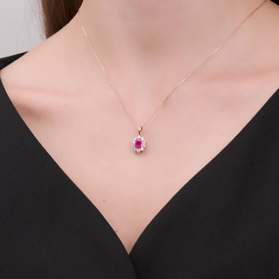 Подвеска с 10 бриллиантами природными, 0.35 карат, огранка круг 57 граней, цвет 3, чистота 6, тип огранки А; 1 рубином природным, 0.84 карат, цвет 2, чистота 3, тип огранки Б; Розовое золото 585 пробы.