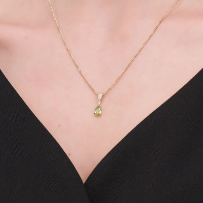 Подвеска с 4 бриллиантами природными, 0.01 карат, огранка круг 17 граней, цвет 2, чистота 2, тип огранки А; 3 бриллиантами природными, 0.006 карат, огранка круг 17 граней, цвет 2, чистота 2, тип огранки А; 1 хризолитом природным, 0.75 карат; Желтое золото 585 пробы.