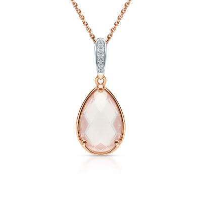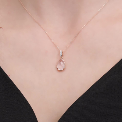 Подвеска с 3 бриллиантами природными, 0.006 карат, огранка круг 17 граней, цвет 2, чистота 2, тип огранки А; 3 бриллиантами природными, 0.005 карат, огранка круг 17 граней, цвет 2, чистота 2, тип огранки А; 1 кварцем розовым природным, 2.52 карат, тип огранки Б; Розовое золото 585 пробы.