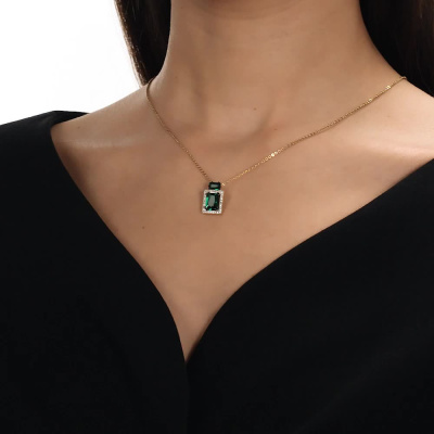 Подвеска с 32 бриллиантами природными, 0.12 карат, огранка круг 17 граней, цвет 2, чистота 2, тип огранки А; 1 гидротермальным изумрудом, 2 карат; 1 гидротермальным изумрудом, 0.5 карат; Желтое золото 585 пробы.