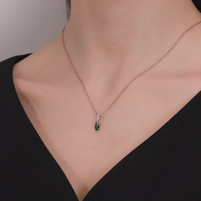 Подвеска с 5 бриллиантами природными, 0.02 карат, огранка круг 17 граней, цвет 2, чистота 2, тип огранки А; 1 гидротермальным изумрудом, 0.38 карат, тип огранки Б; Розовое золото 585 пробы.