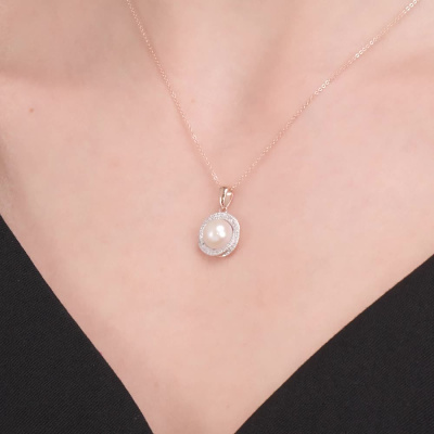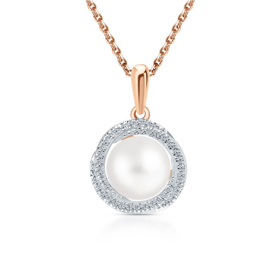 Подвеска с 42 бриллиантами природными, 0.08 карат, огранка круг 17 граней, цвет 2, чистота 2, тип огранки А; 1 жемчугом пресноводным культивированным белым; Розовое золото 585 пробы.
