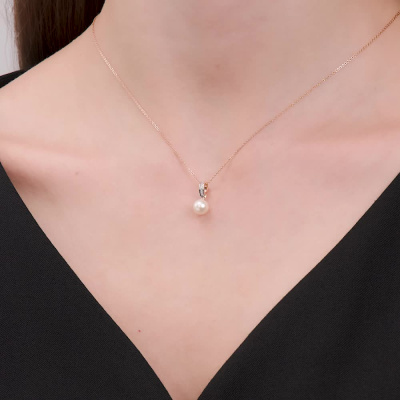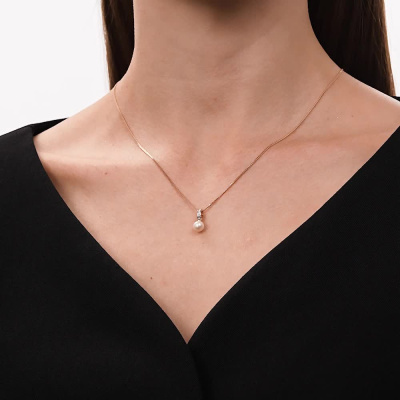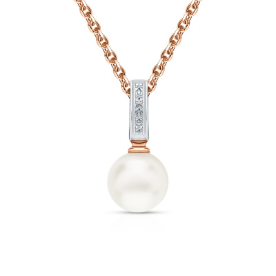 Подвеска с 5 бриллиантами природными, 0.01 карат, огранка круг 17 граней, цвет 2, чистота 2, тип огранки А; 1 жемчугом пресноводным культивированным белым; Розовое золото 585 пробы.