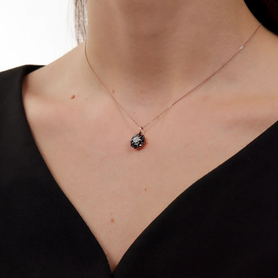 Подвеска с 1 бриллиантом природным, 0.008 карат, огранка круг 17 граней, цвет 2, чистота 2, тип огранки А; 16 сапфирами черными природными, 0.69 карат; Розовое и белое золото 585 пробы.