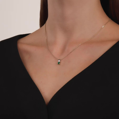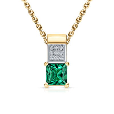 Подвеска с 9 бриллиантами природными, 0.01 карат, огранка круг 17 граней, цвет 2, чистота 2, тип огранки А; 1 гидротермальным изумрудом, 0.26 карат, тип огранки Б; Желтое золото 585 пробы.