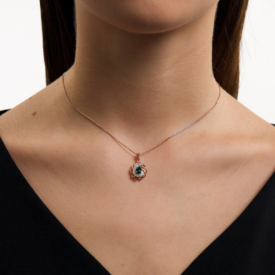 Подвеска с 19 бриллиантами природными, 0.05 карат, огранка круг 17 граней, цвет 2, чистота 2, тип огранки А; 1 гидротермальным изумрудом, 0.34 карат; Розовое золото 585 пробы.