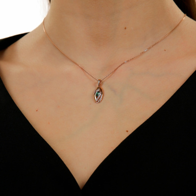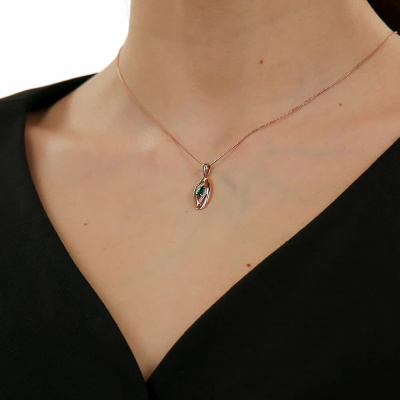 Подвеска с 6 бриллиантами природными, 0.02 карат, огранка круг 17 граней, цвет 2, чистота 2, тип огранки А; 6 бриллиантами природными, 0.01 карат, огранка круг 17 граней, цвет 2, чистота 2, тип огранки А; 1 гидротермальным изумрудом, 0.18 карат; Розовое золото 585 пробы.
