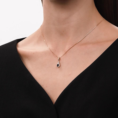 Подвеска с 23 бриллиантами природными, 0.04 карат, огранка круг 17 граней, цвет 2, чистота 2, тип огранки А; 1 сапфиром природным, 0.41 карат, цвет 2, чистота 2, тип огранки Б; Розовое золото 585 пробы.