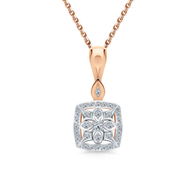 Подвеска с 1 бриллиантом природным, 0.02 карат, огранка круг 57 граней, цвет 4, чистота 5, тип огранки А; 5 бриллиантами природными, 0.03 карат, огранка круг 57 граней, цвет 4, чистота 5, тип огранки А; 32 бриллиантами природными, 0.09 карат, огранка круг 57 граней, цвет 4, чистота 5, тип огранки А; Розовое золото 585 пробы.