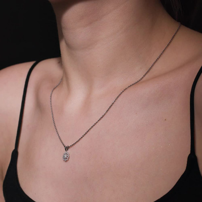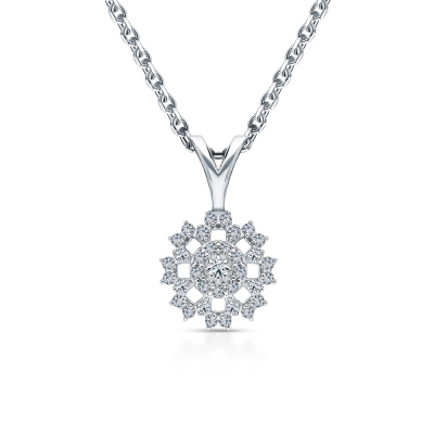 Подвеска с 1 бриллиантом природным, 0.01 карат, огранка круг 57 граней, цвет 4, чистота 6, тип огранки А; 33 бриллиантами природными, 0.13 карат, огранка круг 17 граней, цвет 2, чистота 2, тип огранки А; Белое золото 585 пробы.