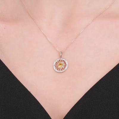 Подвеска с 32 бриллиантами природными, 0.09 карат, огранка круг 17 граней, цвет 2, чистота 2, тип огранки А; 1 сапфиром желтым природным, 0.37 карат; Розовое золото 585 пробы.