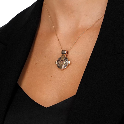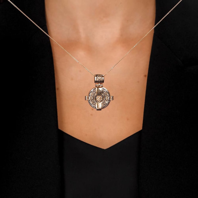 На лицевой части образка из золота изображена икона Спаса Нерукотворного. Внутри образка изображение иконы Казанской Божией Матери, а также сроки из молитвы ей.