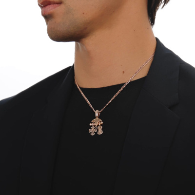 Подвеска в виде креста с изображением Распятия Господа Иисуса Христа и образка с изображением Валаамской иконы Божией Матери, которая почитается как целительная при различных недугах.