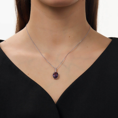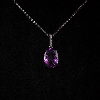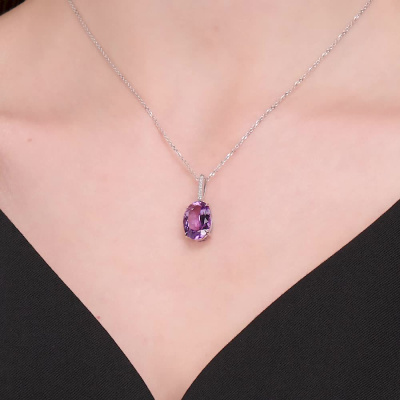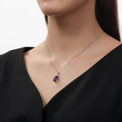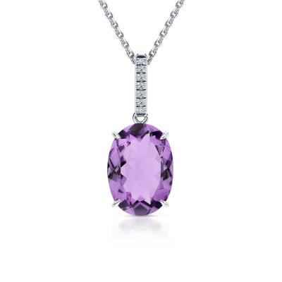 Подвеска с 7 бриллиантами природными, 0.02 карат, огранка круг 17 граней, цвет 2, чистота 2, тип огранки А; 1 аметистом природным, 4.42 карат; Белое золото 585 пробы.