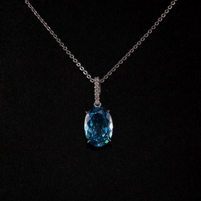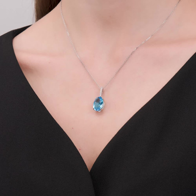 Подвеска с 7 бриллиантами природными, 0.02 карат, огранка круг 17 граней, цвет 2, чистота 2, тип огранки А; 1 топазом свисс природным, 6.66 карат; Белое золото 585 пробы.