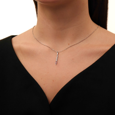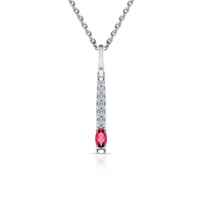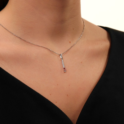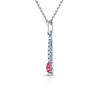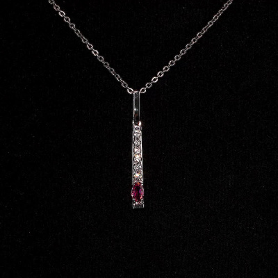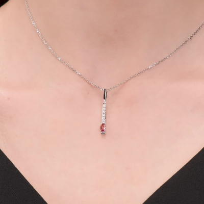 Подвеска с 2 бриллиантами природными, 0.04 карат, огранка круг 57 граней, цвет 3, чистота 6, тип огранки А; 2 бриллиантами природными, 0.03 карат, огранка круг 57 граней, цвет 3, чистота 6, тип огранки А; 2 бриллиантами природными, 0.02 карат, огранка круг 57 граней, цвет 3, чистота 6, тип огранки А; 1 турмалином розовым природным, 0.2 карат; Белое золото 585 пробы.