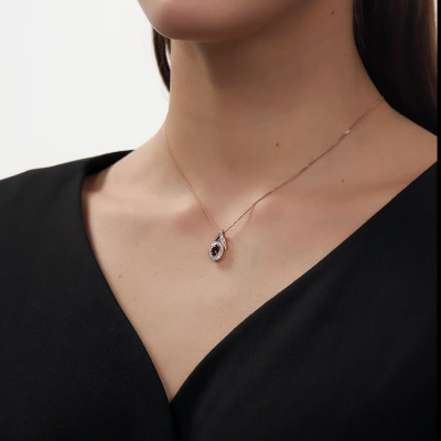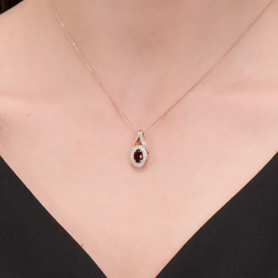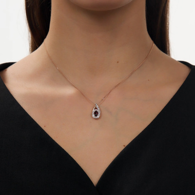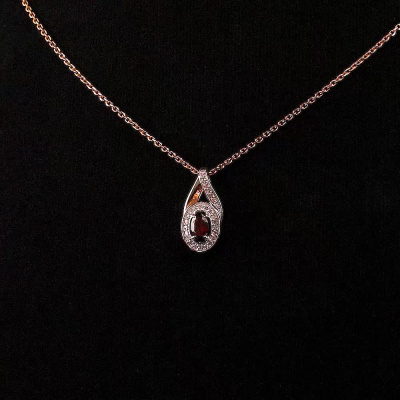 Подвеска с 23 бриллиантами природными, 0.1 карат, огранка круг 17 граней, цвет 2, чистота 2, тип огранки А; 4 бриллиантами природными, 0.007 карат, огранка круг 17 граней, цвет 2, чистота 2, тип огранки А; 1 гранатом природным, 0.54 карат; Розовое золото 585 пробы.