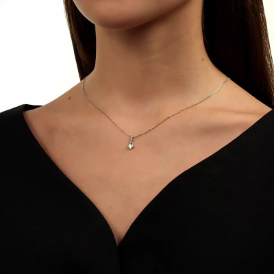 Подвеска с 1 бриллиантом природным, 0.25 карат, огранка круг 57 граней, цвет 3, чистота 6, тип огранки А; 19 бриллиантами природными, 0.03 карат, огранка круг 17 граней, цвет 2, чистота 2, тип огранки А; Белое золото 585 пробы.