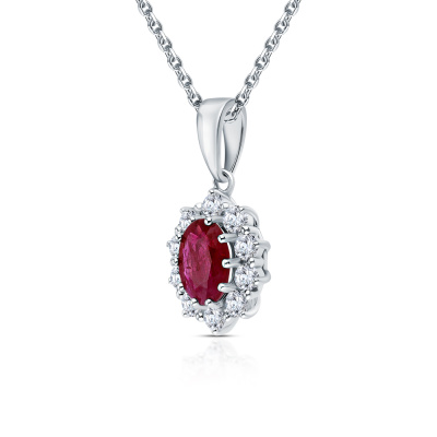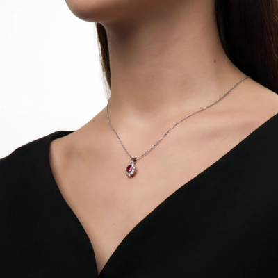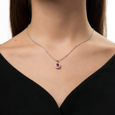 Подвеска с 10 бриллиантами природными, 0.35 карат, огранка круг 57 граней, цвет 3, чистота 6, тип огранки А; 1 рубином природным, 0.83 карат, цвет 2, чистота 2, тип огранки Б; Белое золото 585 пробы.
