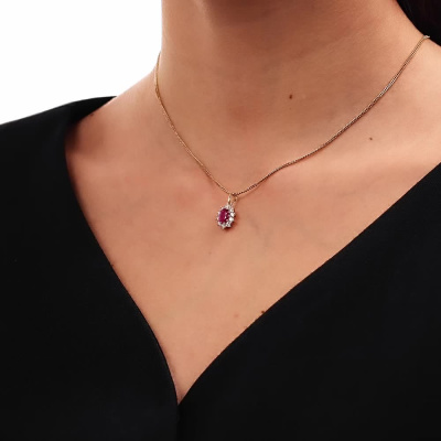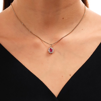 Подвеска с 10 бриллиантами природными, 0.36 карат, огранка круг 57 граней, цвет 3, чистота 5, тип огранки А; 1 рубином природным, 0.85 карат, цвет 2, чистота 2, тип огранки Б; Желтое золото 585 пробы.