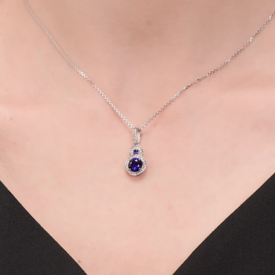 Подвеска с 13 бриллиантами природными, 0.05 карат, огранка круг 17 граней, цвет 2, чистота 2, тип огранки А; 23 бриллиантами природными, 0.06 карат, огранка круг 17 граней, цвет 2, чистота 2, тип огранки А; 1 сапфиром синтетическим, 1.04 карат; 1 сапфиром синтетическим, 0.04 карат; Белое золото 585 пробы.