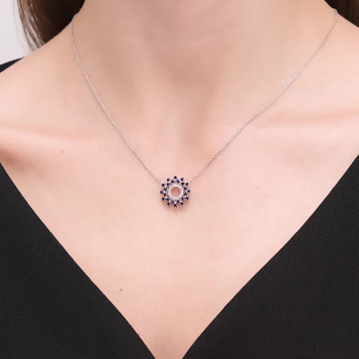 Шейное укр. с 16 бриллиантами природными, 0.05 карат, огранка круг 17 граней, цвет 2, чистота 2, тип огранки А; 24 сапфирами синтетическими, 0.19 карат, тип огранки В; Белое золото 585 пробы.