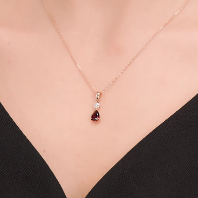 Подвеска с 7 бриллиантами природными, 0.05 карат, огранка круг 17 граней, цвет 2, чистота 2, тип огранки А; 1 гранатом природным, 0.83 карат; Розовое золото 585 пробы.
