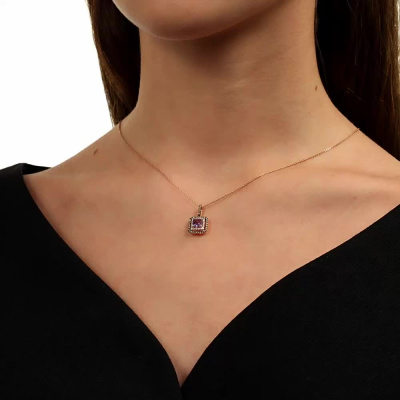 Подвеска с 24 бриллиантами природными, 0.05 карат, огранка круг 17 граней, цвет 2, чистота 2, тип огранки А; 1 аметистом природным, 0.57 карат; 34 бриллиантами коньячными природными, 0.13 карат, огранка круг 57 граней, цвет 7, чистота 5, тип огранки А; Розовое золото 585 пробы.