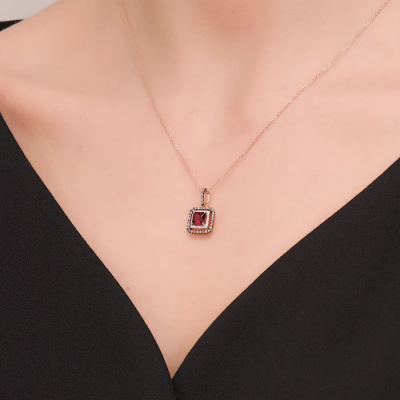 Подвеска с 24 бриллиантами природными, 0.05 карат, огранка круг 17 граней, цвет 2, чистота 2, тип огранки А; 1 гранатом природным, 0.77 карат; 34 бриллиантами коньячными природными, 0.13 карат, огранка круг 57 граней, цвет 7, чистота 5, тип огранки А; Розовое золото 585 пробы.