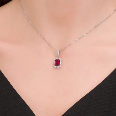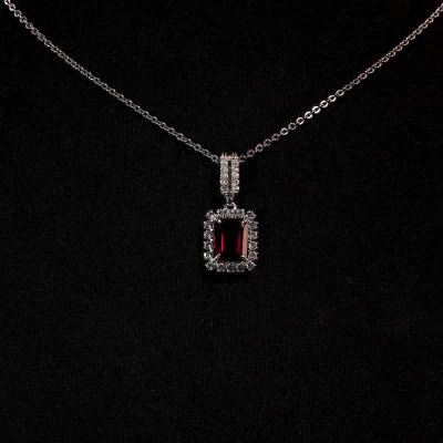 Подвеска с 12 бриллиантами природными, 0.04 карат, огранка круг 17 граней, цвет 2, чистота 2, тип огранки А; 1 родолитом природным, 1.97 карат; 18 сапфирами бесцветными природными, 0.32 карат; Белое золото 585 пробы.